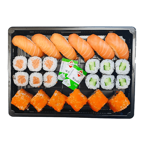 43 stuks - 6 stuks kappa hosomaki - 6 stuks sake hosomaki - 5 stuks sake nigiri - 5 stuks maguro nigiri - 3 stuks rainbow california uramaki - 3 stuks sake avocado uramaki - 3 stuks truffle sake uramaki - 3 stuks spicy tori uramaki - 3 stuks crispy ebi uramaki - 3 stuks vegetarian uramaki - 3 stuks california uramaki